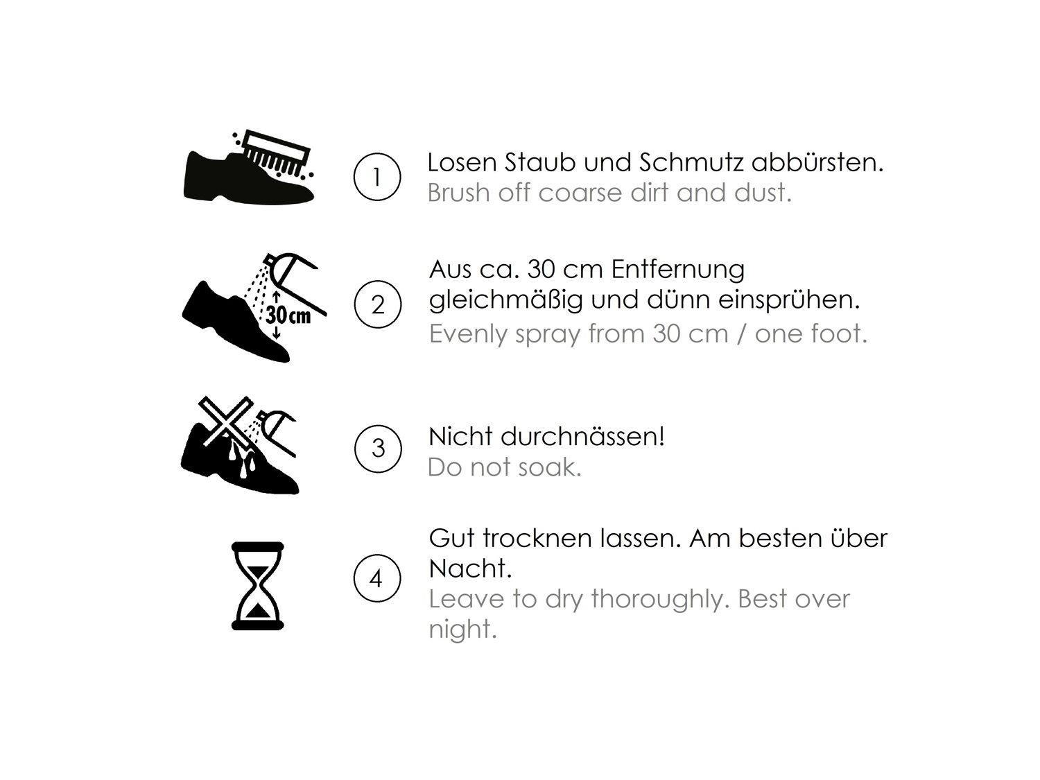 Staub und Schmutz entfernen. Vor Gebrauch Materialverträglichkeit prüfen. Aus ca. 30 cm Entfernung gleichmässig einsprühen. Nicht durchnässen.