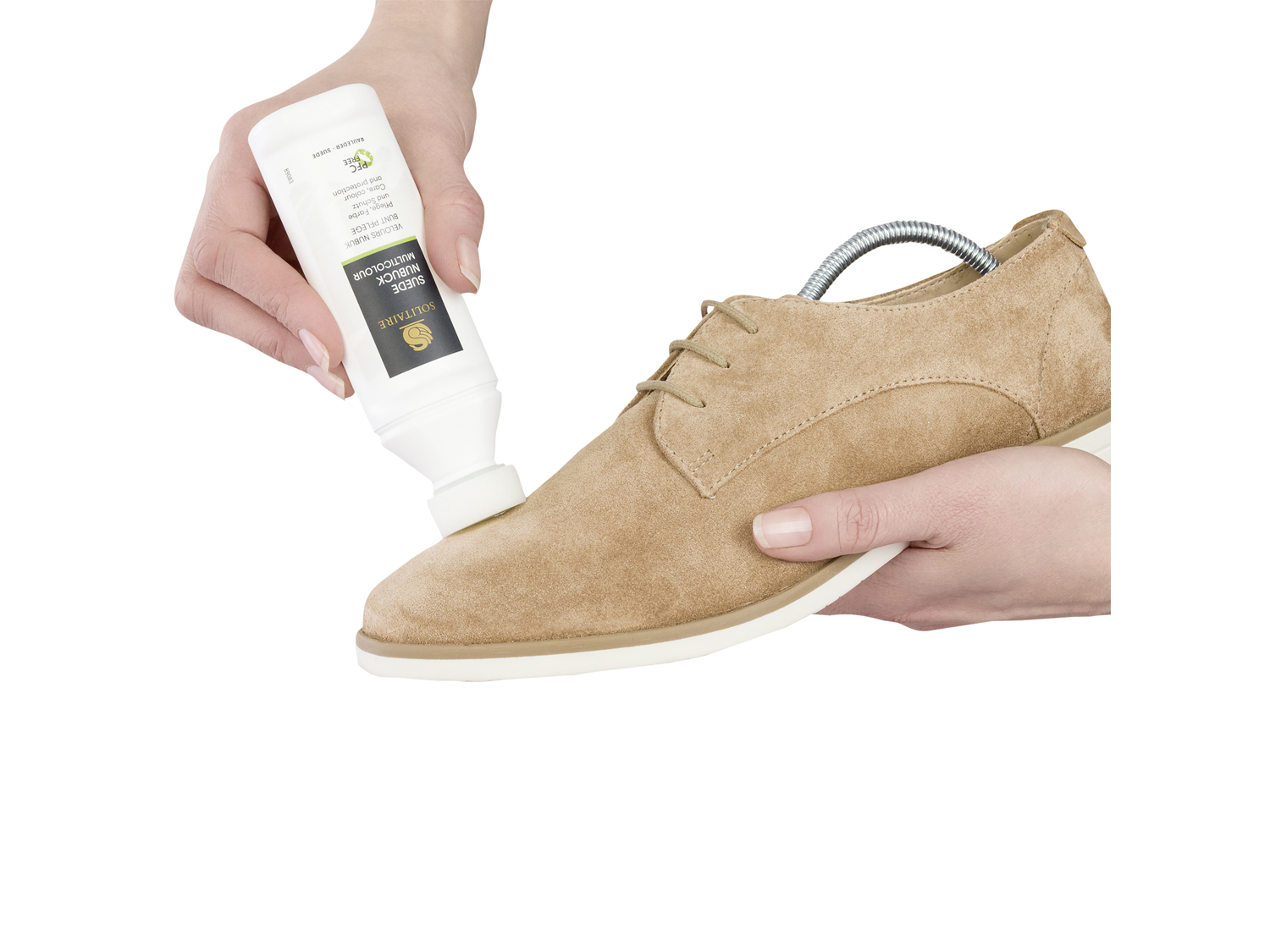 ANWENDUNG: Flasche vor Gebrauch schütteln. Die Flüssigkeit durch Auftupfen gleichmäßig auf dem Schuh verteilen. Trocknen lassen und bei Bedarf mit einer Raulederbürste aufrauen.