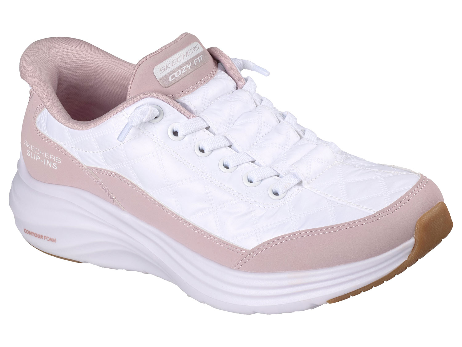 Verwöhne deine Füße mit einem lässigen und bequemen Look mit dem Skechers Hands Free Slip-Ins®: Contour Foam%u2122 - Cozy Fit%u2122. Dieser Slip-On ist mit dem exklusiven Skechers Fersenkissen (Heel Pillow%u2122)%u2122 ausgestattet und verfügt über ein Obermaterial aus gestepptem Cozy Fit%u2122-Mesh mit Metallic-Duraleder, eine lose Stretch-Schnürung, eine Zwischensohle mit Contour Foam%u2122 Dämpfung und eine gepolsterte Skechers Air-Cooled Memory Foam%u2122-Einlegesohle.