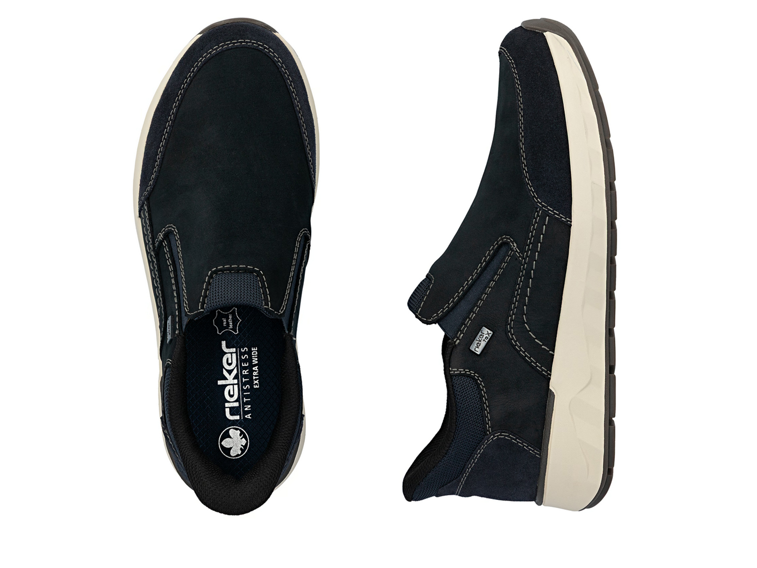 Style UND Komfort - hier gibt es kein oder! Diese blauen Rieker Slipper für Herren aus Rauleder sind perfekt geeignet für jeden Tag. Der Gummizug macht das An- und Ausziehen einfach und bequem. Die flexible und sehr leichte Sohle sorgt für ein angenehmes Tragegefühl. Dank der gepolsterten und herausnehmbaren Einlegesohle ist bester Komfort gegeben. Der Schuh ist in Extraweite geschnitten. Die RiekerTEX-Technologie hält die Füße bei jedem Wetter trocken. Hineinschlüpfen und wohlfühlen!